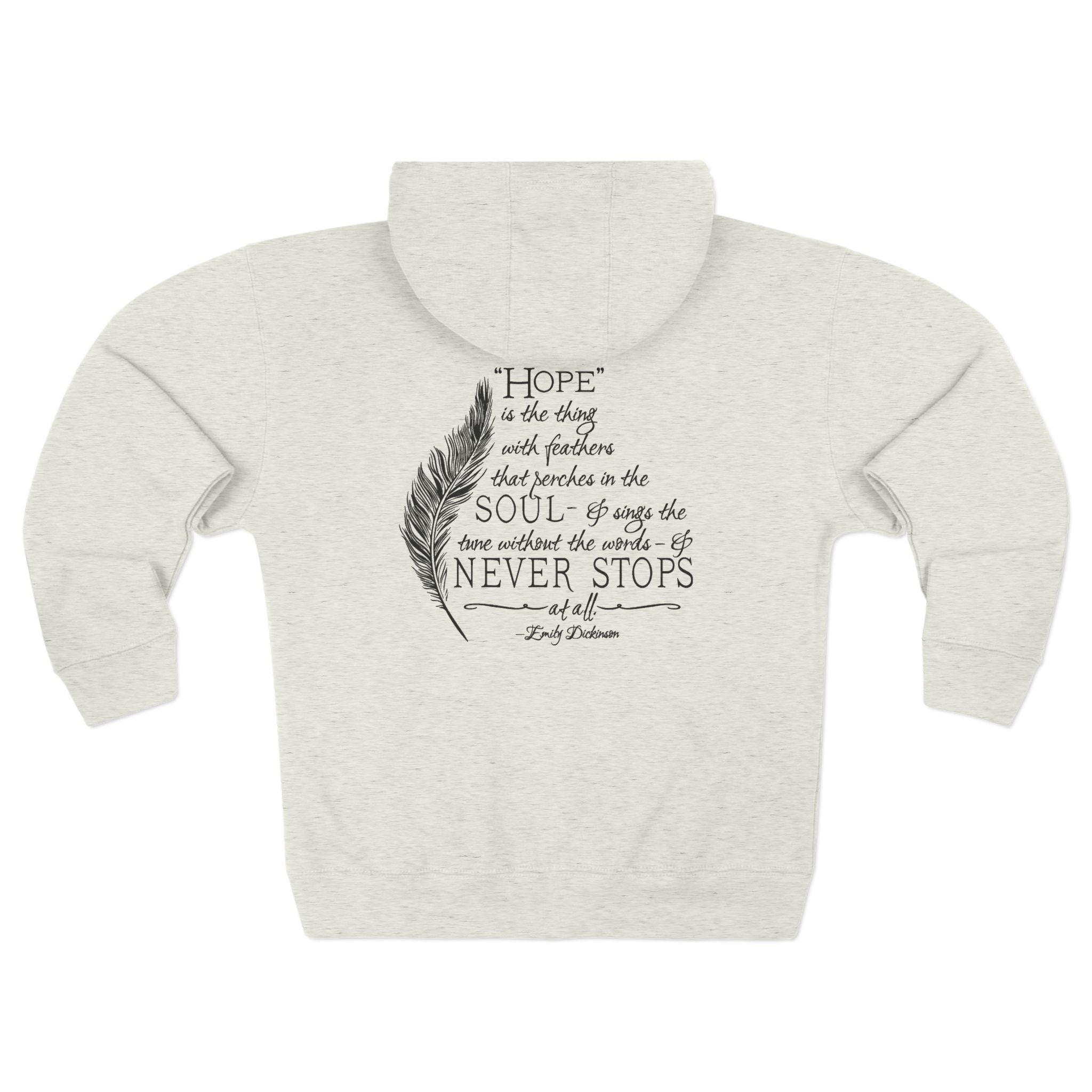 American poet Emily Dickinson’s beautiful imagery of enduring hope graces this poly-cotton blend hoodie in an original design with illustration. Printed in white on royal blue or black on oatmeal heather, our Emily Dickinson Quote Full Zip Hoodie will dress up your lazy day attire and give wings to your daydreams. Its strong, steadfast comfort won’t disappoint. Wear and share this reminder to persevere and help your heart feel light as a feather!
