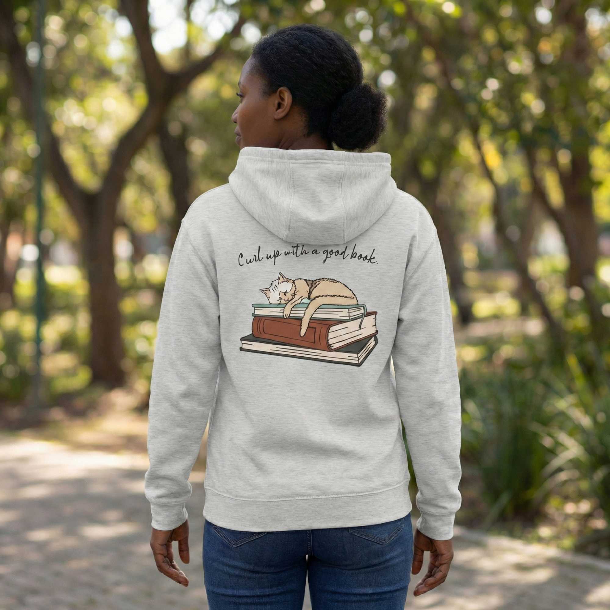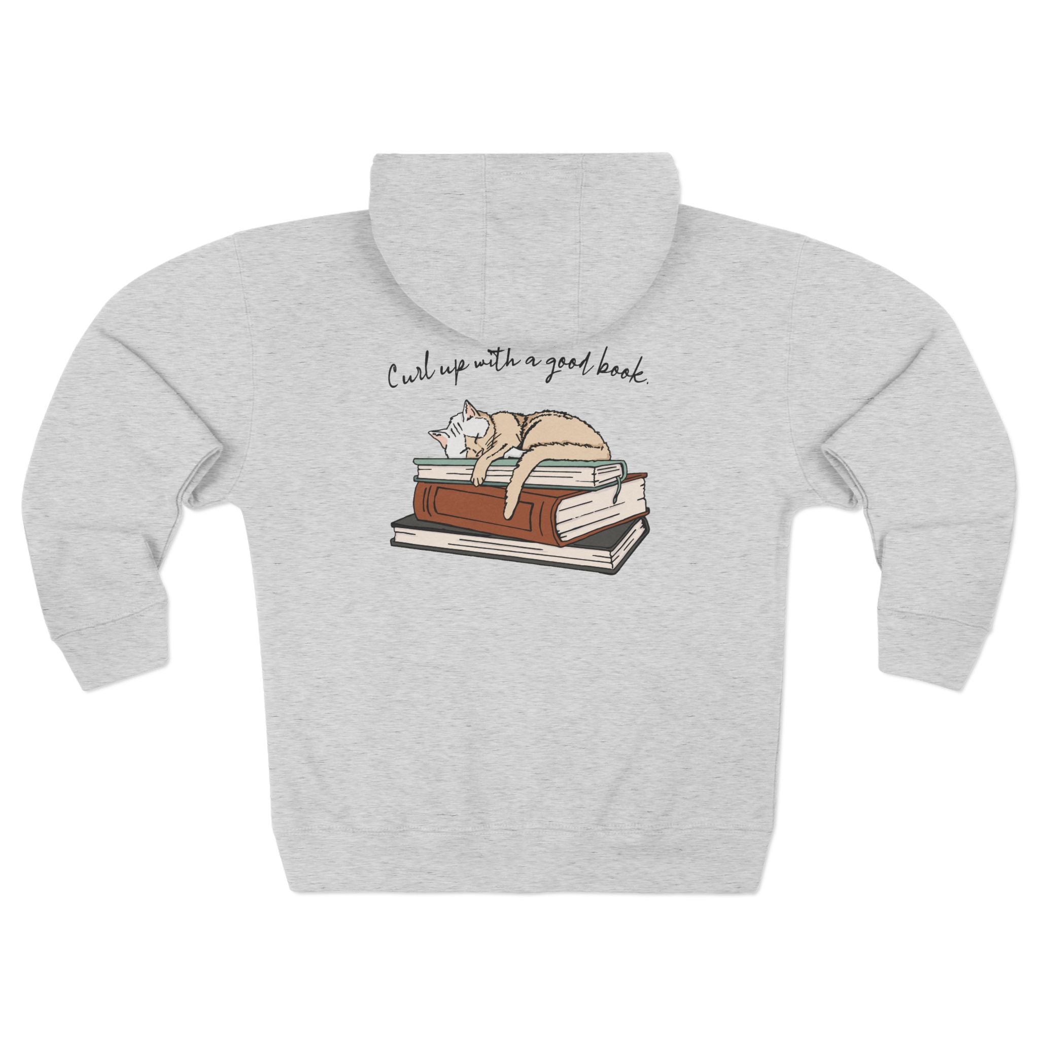 Relax in style with our Curl Up with a Good Book unisex Full Zip Hoodie. A sweatshirt for book lovers and cat lovers alike! This soft hoodie displays a charming cat curled up on a book stack, creating the perfect blend of cozy literary vibes.