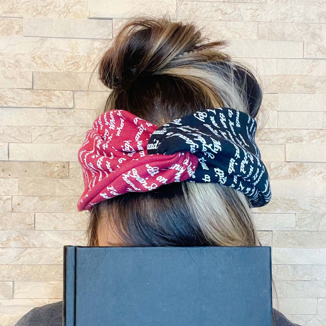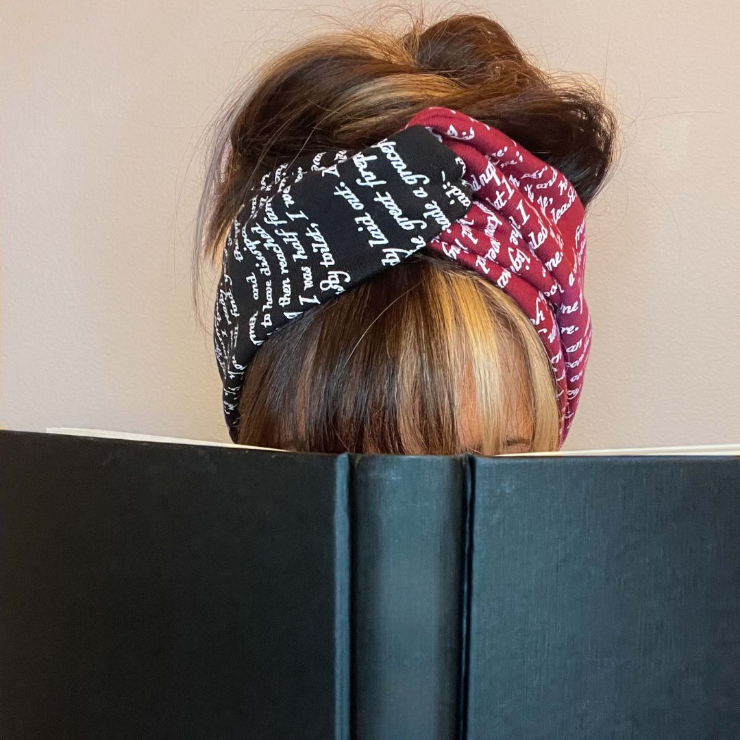 Our Book Band Headbands are made from the same fabric and print as the matching scarf. Text placement will vary from piece to piece; the entire selection does not fit on each piece.