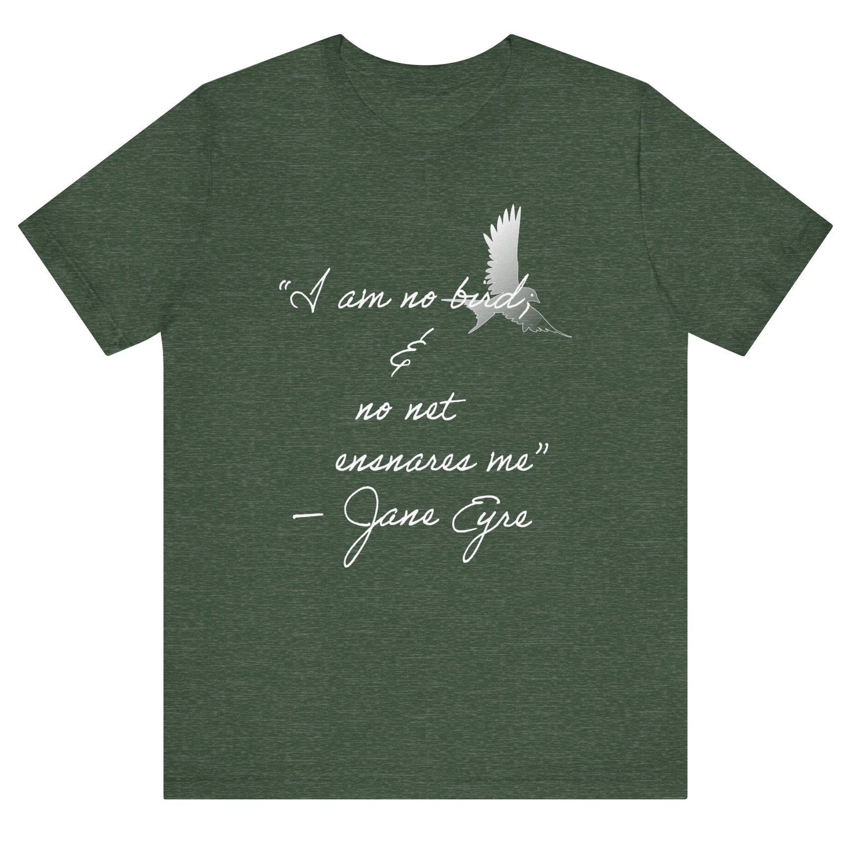 Celebrate fierce independence with this beautifully minimalist Jane Eyre quote tee. Featuring Charlotte Brontë’s timeless words — “I am no bird; and no net ensnares me” — the design captures the spirit of freedom with a single bird in flight, rendered in soft silver tones.