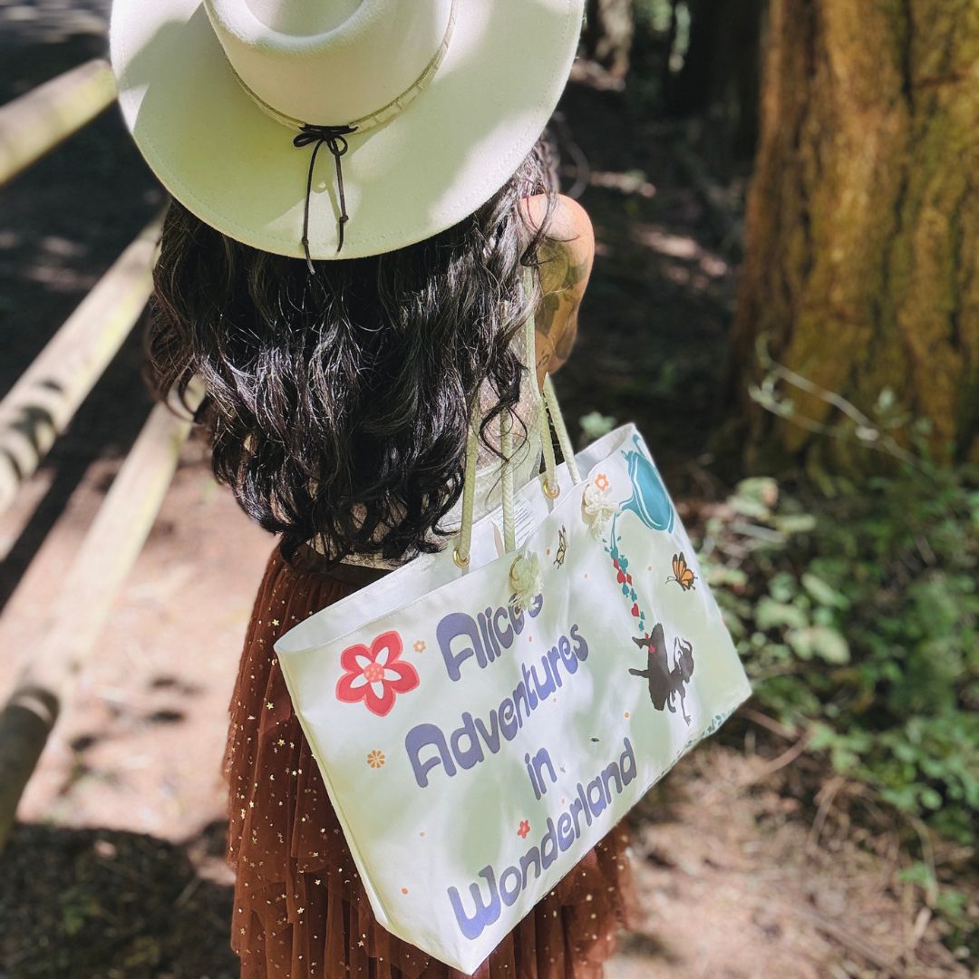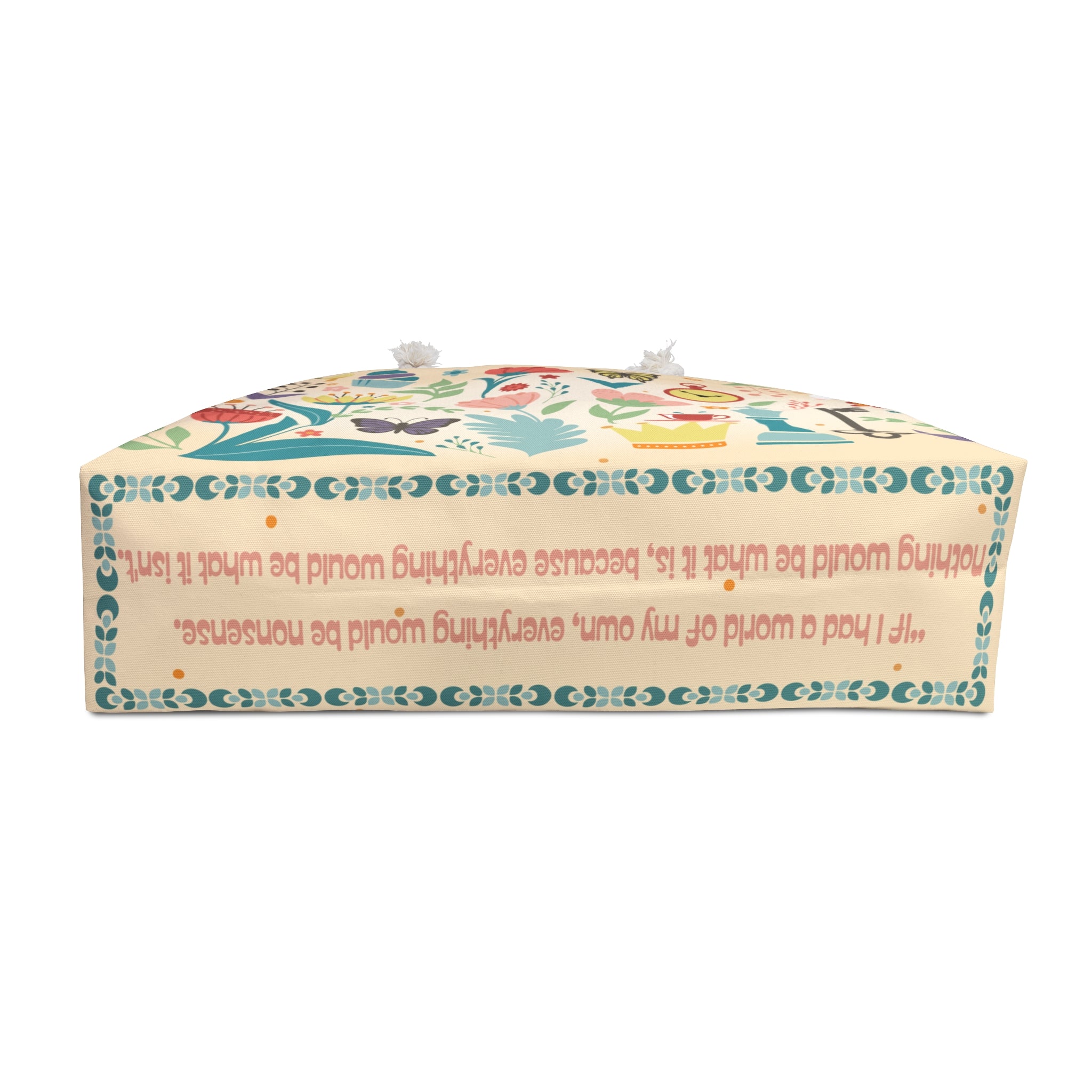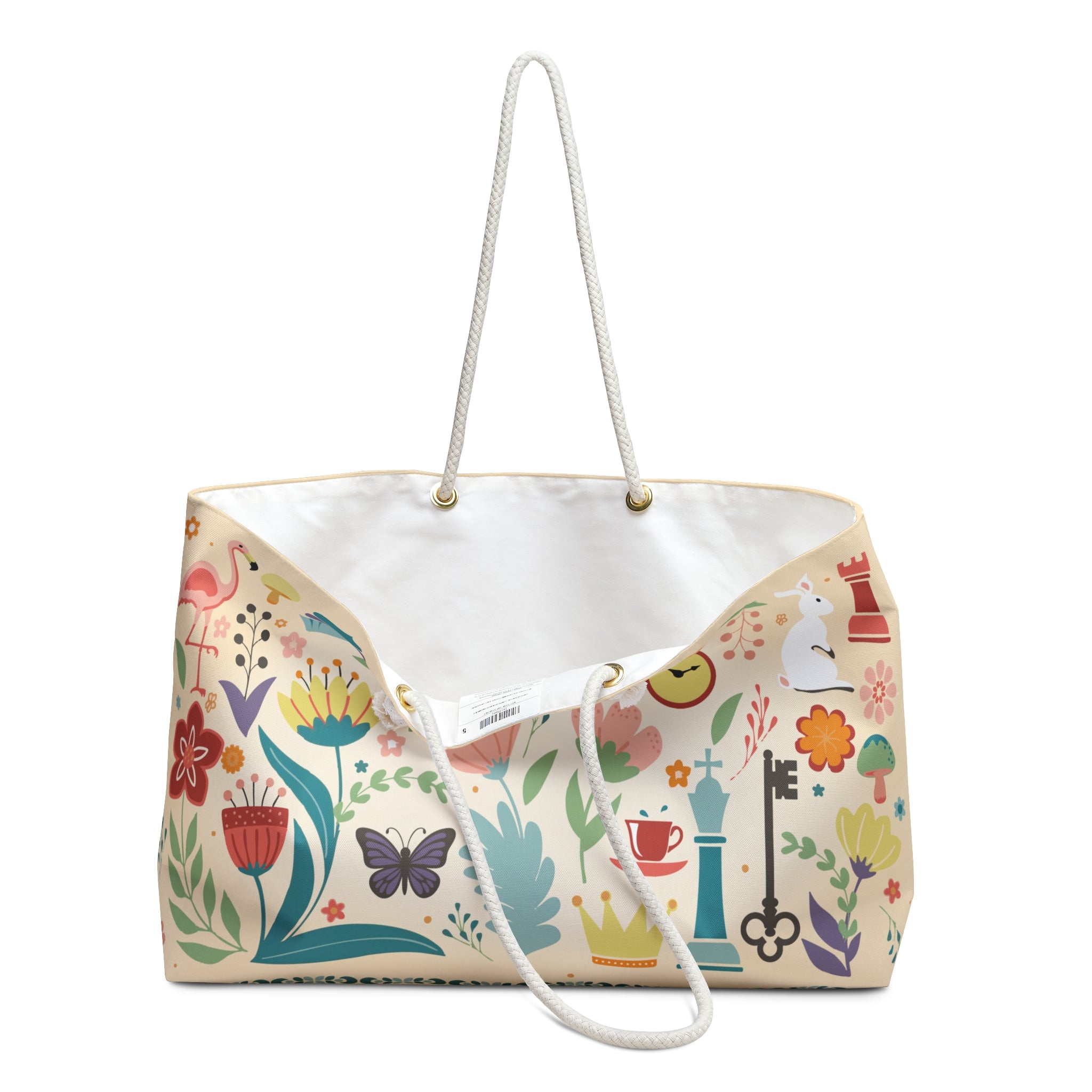 Take a piece of Wonderland with you wherever you go! This charming tote bag features a colorful collage of Alice’s Adventures in Wonderland icons—Alice, the white rabbit, teacups, mushrooms, playing card suits, chess pieces, and blooming flowers—capturing the magic and mischief of Lewis Carroll’s beloved tale. Our roomy weekenders are just what you want for stuffing the little somethings needed for a quick trip away.